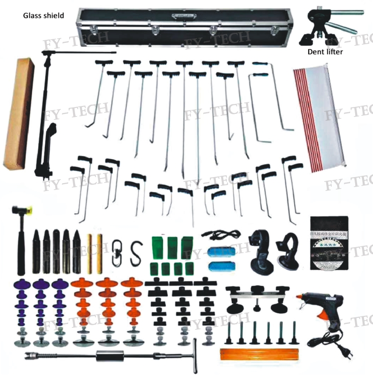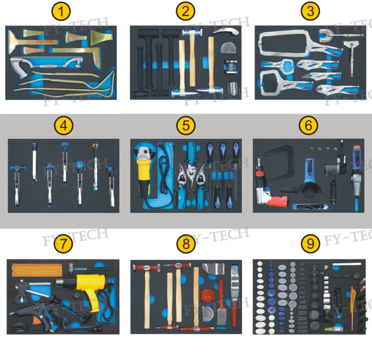 FY-9060 is specialized for aluminium car body repair, which includes various optional tools combinations, such as tools for collision repair, tools for riveting, dent repair glue pulling kit and IGBT inverter dent puller. Users can choose different combinations to meet their request.
