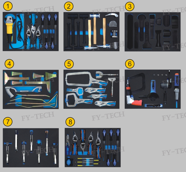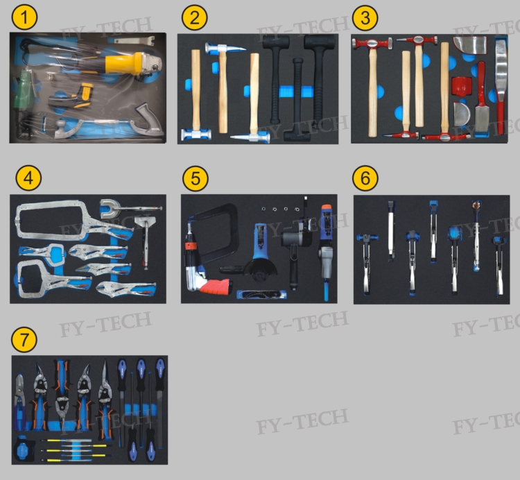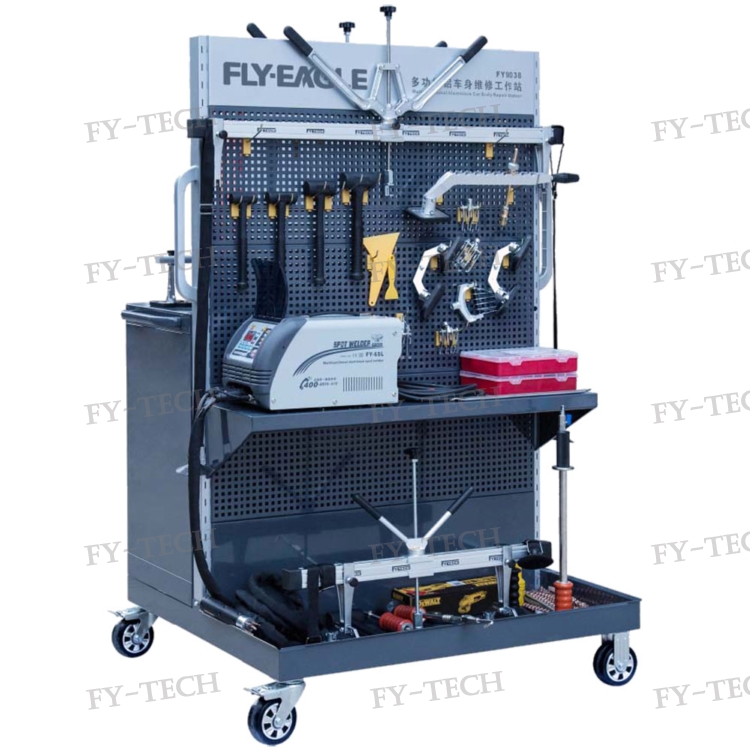FY-9038 is specialized for aluminium car body repair, which includes various combinations, such as tools for collision repair, IGBT inverter aluminium dent puller, crossbar lifters, dent repair glue pulling kit and so on. Optional tools and IGBT inverter aluminium dent pullers are available to meet users' need.